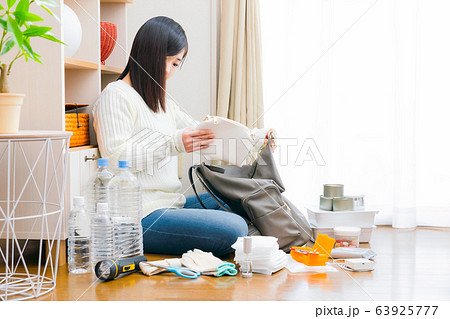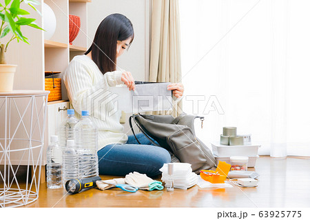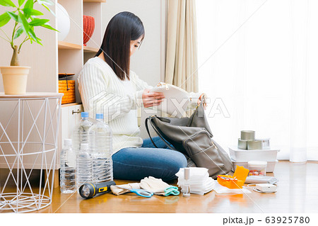 防災グッズを準備する女性 ポーチ 防災 避難 対策 備え コピースペース