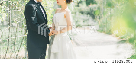 公園の並木道を手を繋いで歩くドレス姿のカップル(ウェディング・ウェディングフォト・新郎新婦)