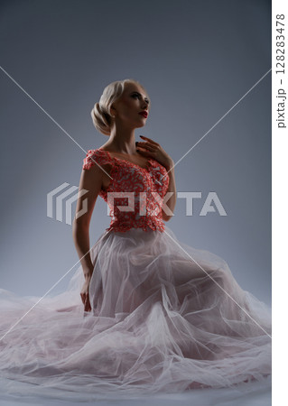 Young woman in a peach fuzz wedding dress, the color trend of 2024