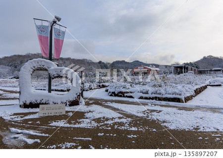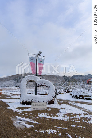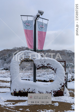 岐阜ワールドローズガーデンの雪化粧ウェルコムゲート 冬の公園入口