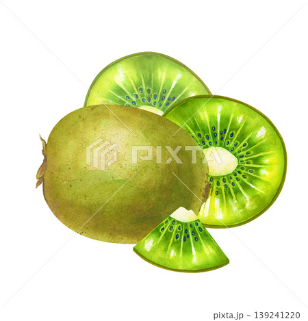 Watercolor composition with fresh tropical kiwi fruit includes a whole fuzzy kiwi, a vibrant juicy halfs and a small wedge. Isolated on a white background. Perfect for organic food packaging, smoothie