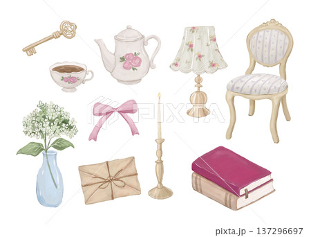 Watercolour vintage home decor collection with illustration set and furniture objects. Classic interior elements