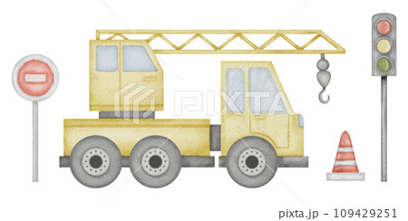 Truck Crane Watercolor illustration. Set of baby car toy. Hand drawn clip art of road sign and traffic light on isolated background. Autocrane and signpost drawing for stickers and prints.