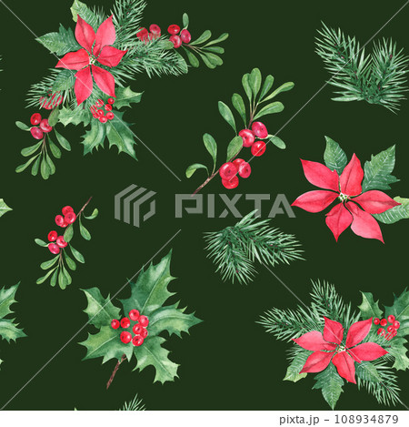 Christmas hand drawn seamless pattern with winter plants. Forest pine branches, holly with red berries, red poinsettia and cowberry or lingonberry on dark green background. For fabric or textile