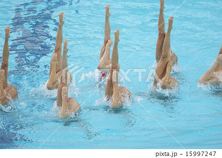 Synchronized swimmers performing a dynamic routine in a bright blue pool with splashes of water