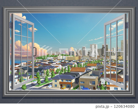 都市 住宅街 CG 窓からの風景 街並み 海のある背景