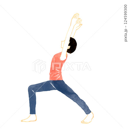 戦士のポーズ(英雄のポーズ)をする女性 ヨガ・ストレッチの手描き水彩イラスト素材