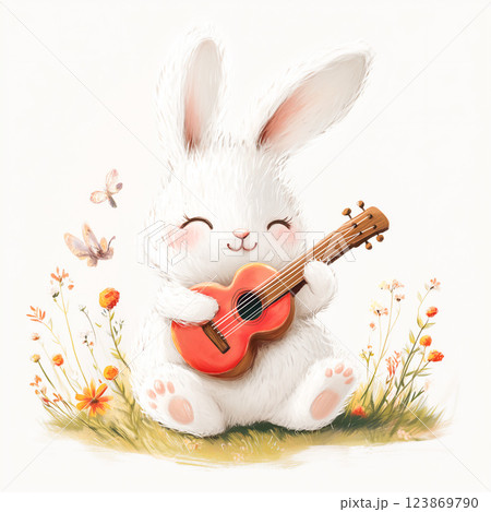 ウクレレを奏でる幸せそうな白うさぎ