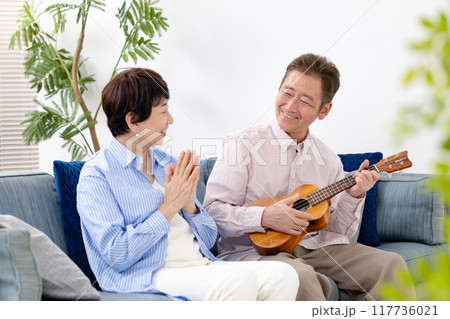 リビングのソファーで趣味のウクレレを弾くシニア女性