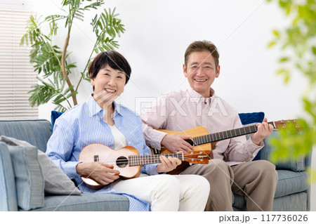 リビングのソファーで趣味のウクレレを弾くシニア女性