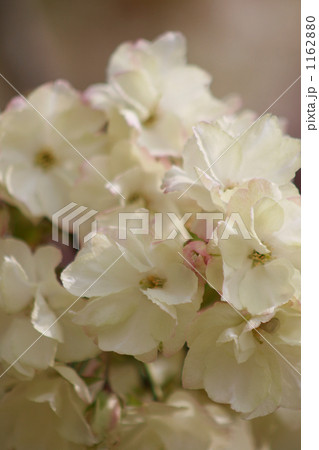 満開の八重桜(鬱金)のクローズアップ 【白背景】 【空背景】