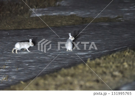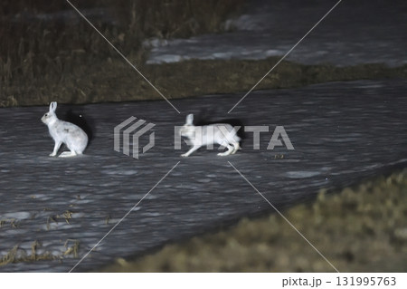 北海道十勝地方の雪の残る草原で深夜に活動する冬毛の2匹のエゾユキウサギ