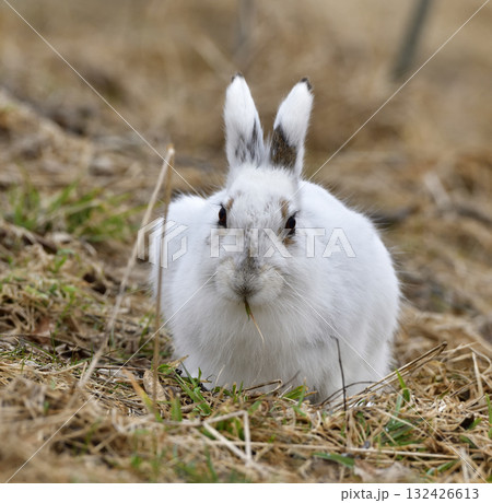 北海道十勝地方の雪の残る草原で深夜に活動する冬毛のエゾユキウサギ