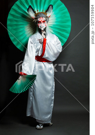 Creative portrait of attractive young woman rabbit in white kimono standing on black background.