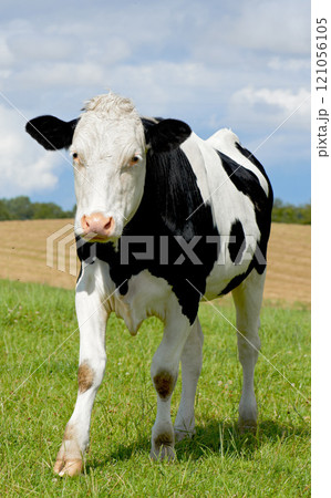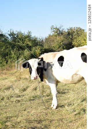 Milk cow grazing on green farm pasture on summer day. Feeding of cattle on farmland grassland