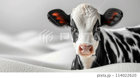 A cartoon cow with a white face and black spots stands in front of a orange background.