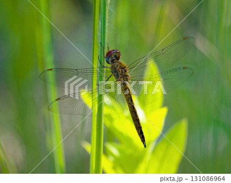 新緑の葉に止まるウスバキトンボ