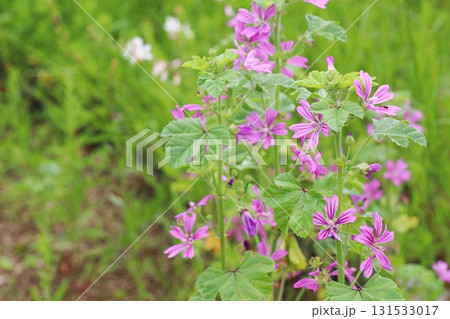 紫色のマロウの花の咲く風景