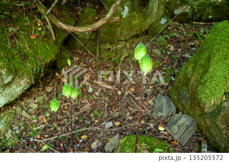 晩夏、ウバユリが大きな実をつけ、森の中に季節の深まりを感じさせます。特徴的な実の姿は、晩夏から秋へと