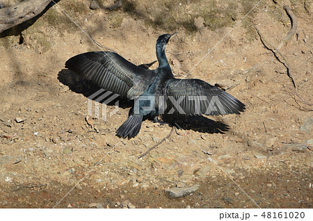 東京都三鷹市の野鳥 仙川河岸の岩場で羽根を広げ濡れた翼を乾かすカワウ