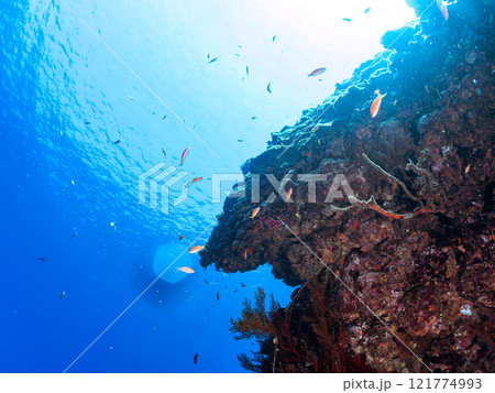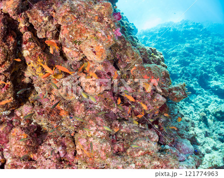 ウミカラマツが生えるドロップオフのキンギョハナダイ、ウメイロモドキ、キホシスズメダイ他の群れ