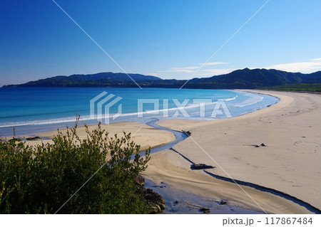 白雲流れる青空を背景に緩やかな円弧を描く土佐清水市大岐海岸の風景 Ver1