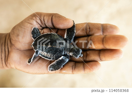 Volunteer hand hold freshly hatched newborn turtle, still covered in sand