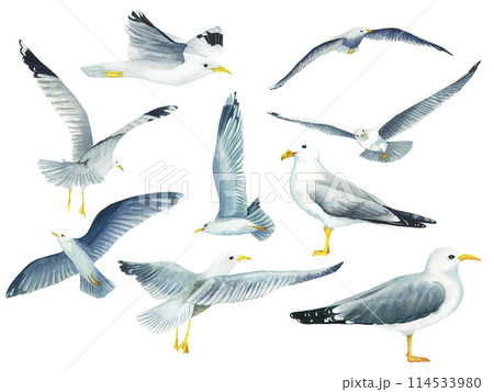 Set of watercolor flying in the sky and standing seagulls isolated on white background. Hand drawn illustration on the theme of sea fishing. Children's, marine, tourist. For design, prints, patterns,