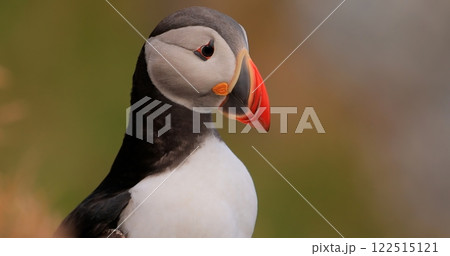 Puffin in the Iceland. Seabirds on sheer cliffs. Birds on the Westfjord in the Iceland.