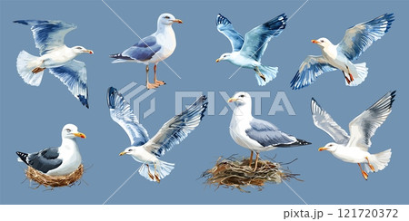 Seagull set. Flying with wings spread opened. On the nest wild marine white seabird gull. Flight nature symbol of freedom. Beauty in the wild life. Watercolor style isolated vector clipart collection