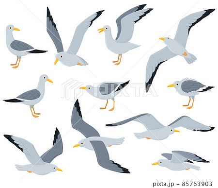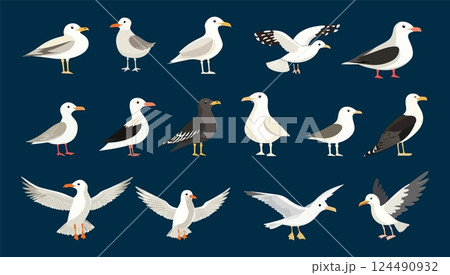 Seagull birds. Different seagulls flying and stand. Cartoon ocean sea nature wild bird. White and dark animals, beach coast landscape vector character