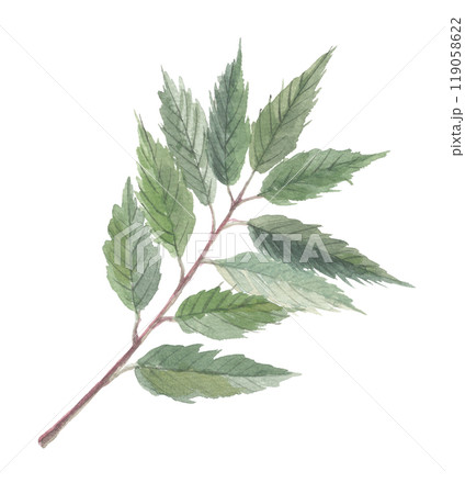 水彩で描いた刻んだウラジロガシ 裏白樫