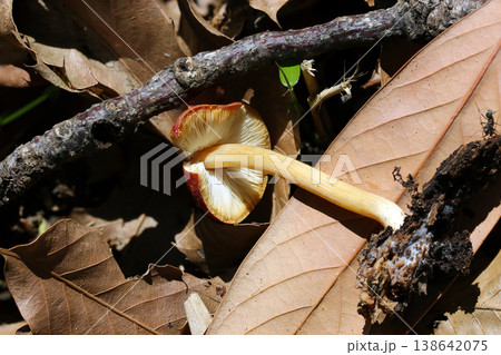 動物に囓られた黄色のウラベニガサ属キノコ(自然環境下マクロ)