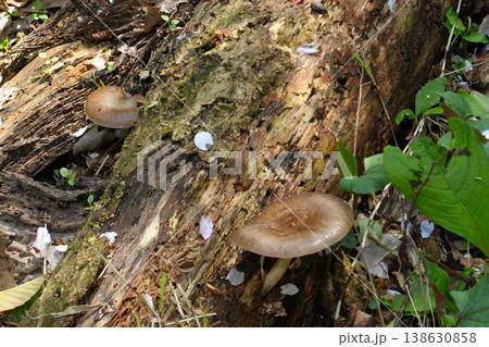 日本の春、桜散る朽ち木が横たわる林床にウラベニガサ茸(自然環境下菌・キノコマクロ撮影)