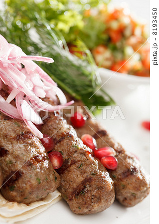 Fresh minced beef and lamb kebabs with fresh spices, arabic kofta kofte kebab isolated on white background. top view