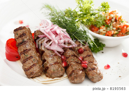 Grilled minced beef and lamb kebabs skewers with fresh spices, arabic kofta kofte kebab isolated on white background. top view
