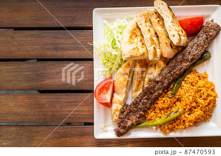 Turkish Adana kebab on a plate with marinated peppers, bread and rice pilaf. Top view. Copy space