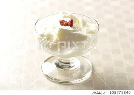 クコの実が乗っているシンプルな杏仁豆腐を白背景で撮影