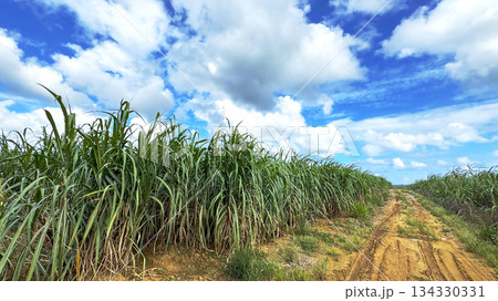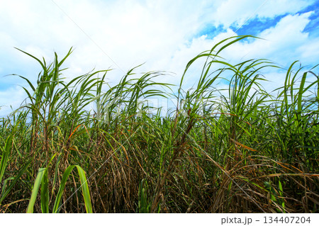 真夏の沖縄サトウキビ畑。青い空と雲