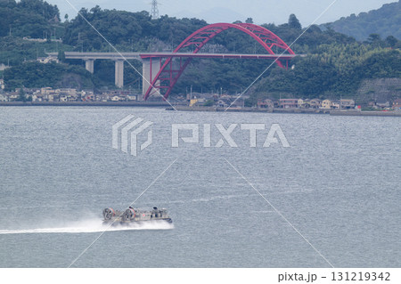 呉湾を疾走する海上自衛隊のLCACと第二音戸大橋