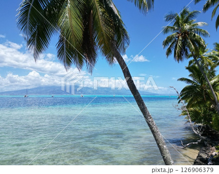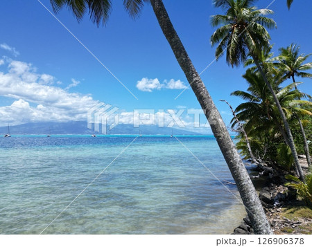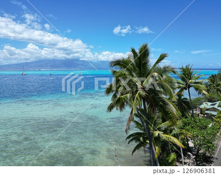 ヤシの木が生い茂るモーレア島の海岸線の空撮