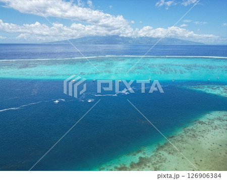 タヒチのモーレア島のラグーンの海岸線の空撮