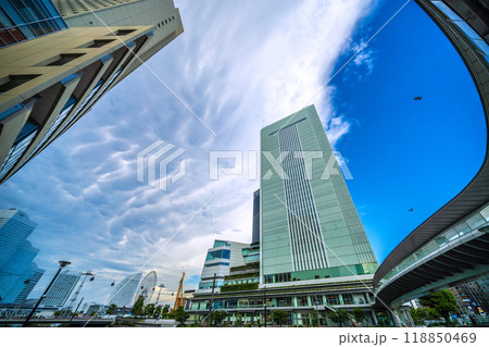 日本の横浜都市景観 急変暗雲と青空の珍景…。桜木町駅 新南口前から横浜市役所などを望む=9月18日