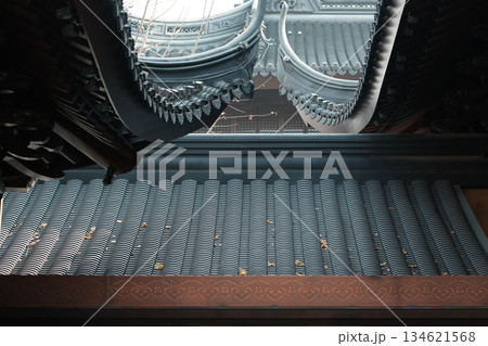 中式傳統建築屋頂瓦片間的銀杏落葉