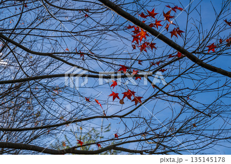 藍天下,幾片紅楓葉點綴著光禿禿的樹枝,展現秋末冬初的蕭瑟與生命力。