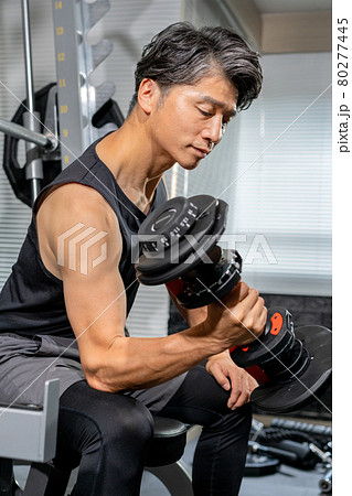ジムでダンベルで身体を鍛えるミドルエイジの男性