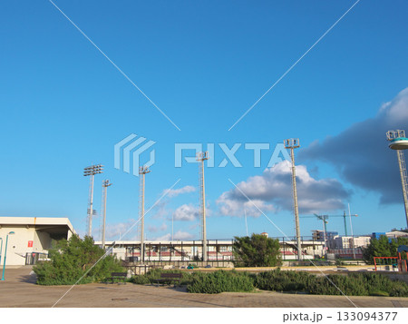 ジブラルタル海峡 エウローパ岬灯台のそばのサッカースタジアム 4月の早朝