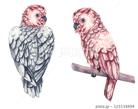 Set of tropical pink parrots on a white background. Watercolor illustration of an Australian bird Gala, a pink-breasted cockatoo on a branch. Tropical birds with drawn feathers. Template for decor