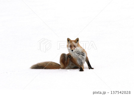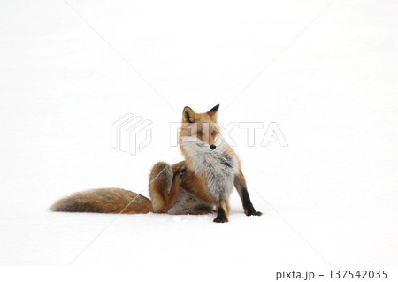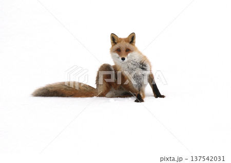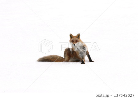 凍結した湖上でくつろぐ冬毛のキタキツネ キツネ 狐 北海道自然 もふもふ