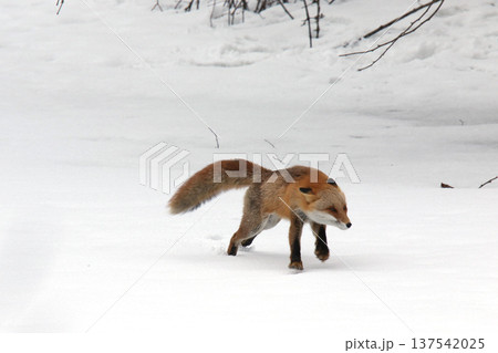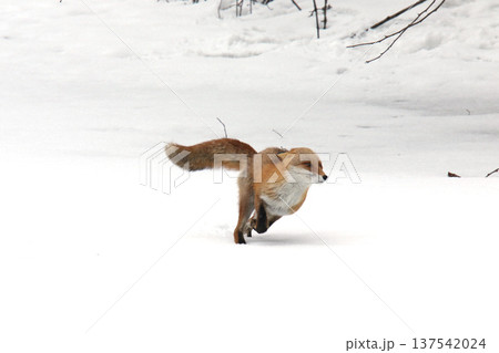 凍結した湖上を疾走する冬毛のキタキツネ キツネ 狐 北海道自然 もふもふ
